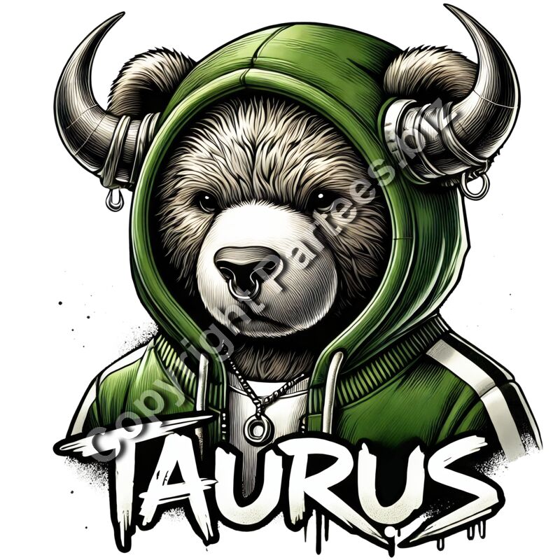 Grounded brown bear wearing a forest green hoodie with large bull horns and a nose ring, "TAURUS" typography in a bold, gritty streetwear style.