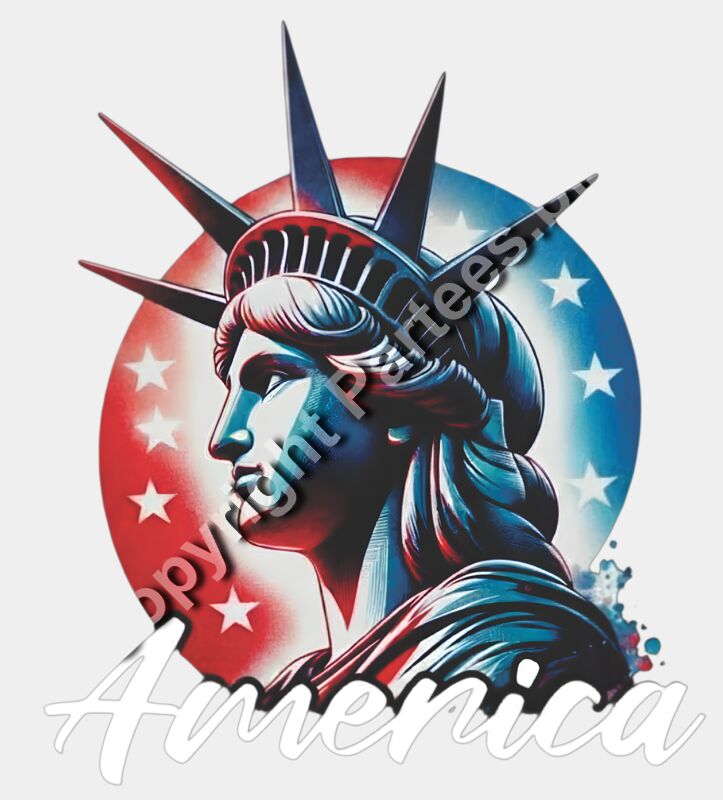 Artistic t-shirt design featuring a side profile of the Statue of Liberty against a red, white, and blue circular star backdrop with "America" in white script.