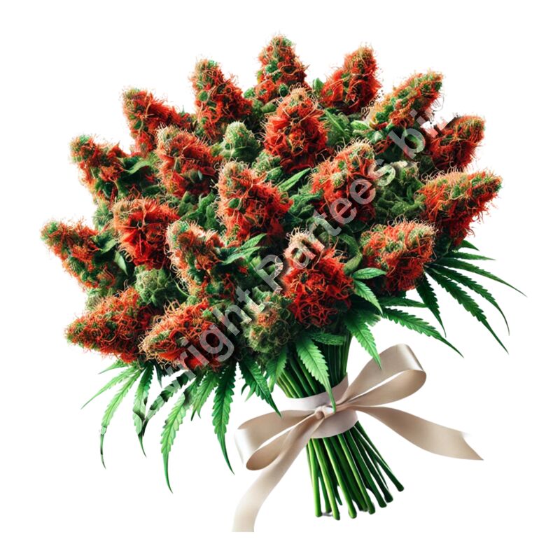 "A vibrant bouquet of large green cannabis buds with bright orange-red pistils, tied with a cream-colored silk ribbon."
