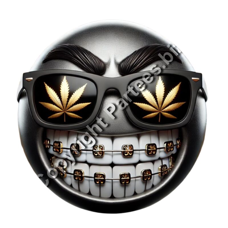 "A 3D metallic gunmetal chrome emoji with thick eyebrows, wearing black sunglasses with gold cannabis leaf reflections and gold dental braces on white teeth."