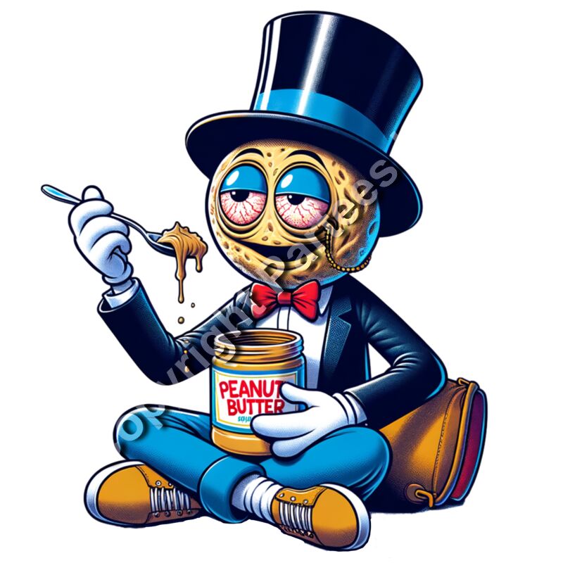 Gritty parody illustration of a dapper peanut mascot with red eyes, wearing a top hat and monocle, sitting while eating peanut butter with a spoon.