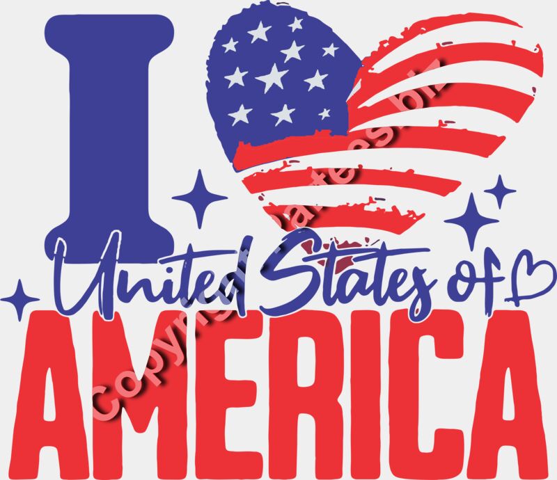 Patriotic t-shirt graphic with a large blue "I", an American flag patterned heart, and the text "United States of AMERICA" in a mix of script and bold block fonts.