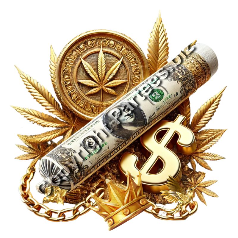 "Streetwear t-shirt design featuring a cannabis joint rolled in a hundred-dollar bill, surrounded by gold marijuana leaves, a gold crown, a dollar sign, and a heavy gold chain."