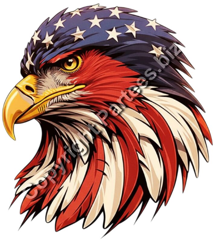 A bold illustration of a bald eagle's head in profile, with its feathers patterned after the American flag (stars on top, red and white stripes on the neck)