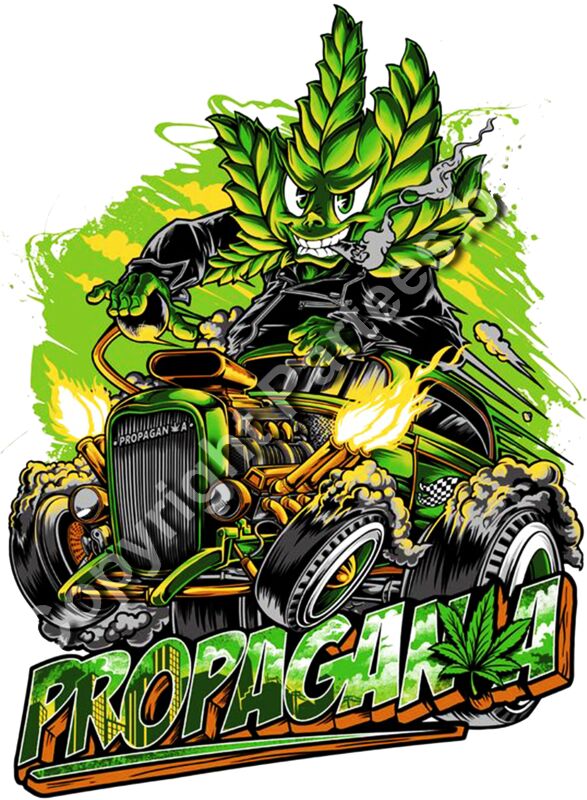 "An edgy 3D-style mascot with a cannabis leaf head driving a green hot rod with flames and smoke. The driver is wearing a black leather jacket and smoking a joint. Below the car is a large 'PROPAGANA' text with a marijuana leaf icon."