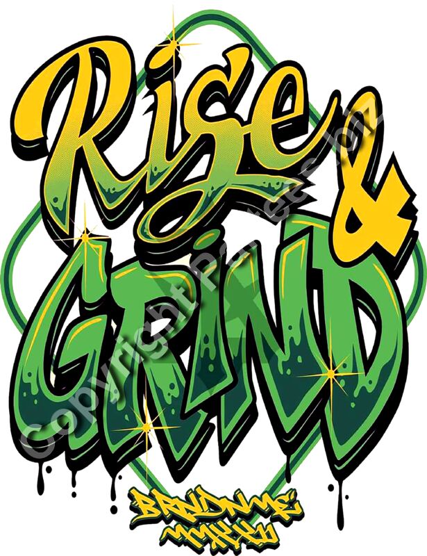 "A bold graffiti-style 3D typography design reading 'Rise & Grind' in vibrant green and yellow. The letters feature a liquid drip effect and sparkling gold accents."