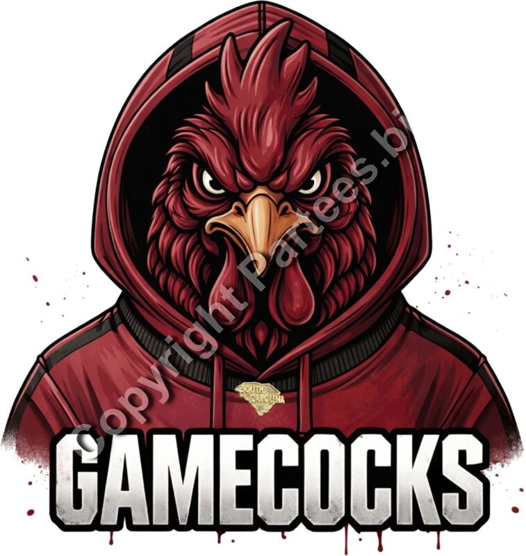 Illustration of a fierce Gamecock mascot wearing a garnet red hooded sweatshirt with a gold South Carolina state-shaped necklace and 'GAMECOCKS' text in a weathered font.