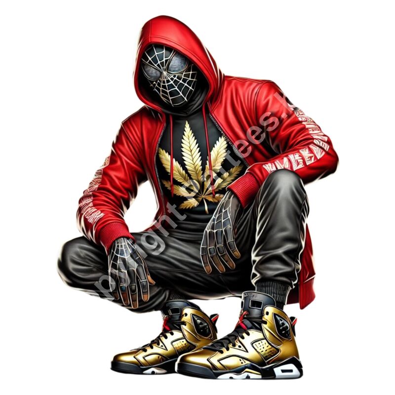 "A masked hero in a red hooded jacket and black webbed mask, crouching in gold sneakers. He is wearing a black shirt with a large gold cannabis leaf on the chest."