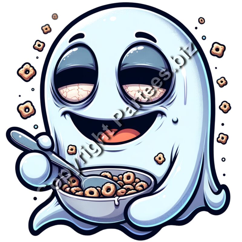 A white cartoon ghost with red, bloodshot eyes happily eating a bowl of cereal, surrounded by floating cereal loops.
