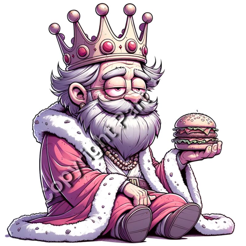 A cartoon king with a white beard, red bloodshot eyes, and a pink royal robe sitting down while holding a large double burger.