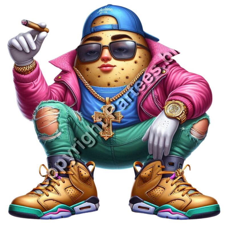 "A 3D cartoon potato mascot with a human face, wearing sunglasses, a blue cap, a pink bomber jacket, and ripped teal jeans. The potato is holding a cigar and rocking a large gold cross chain, a gold watch, and gold high-top sneakers."