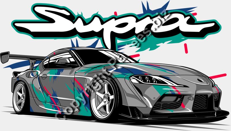 Stylized vector illustration of a grey Toyota Supra GR with teal and pink racing livery and large white "Supra" text background.