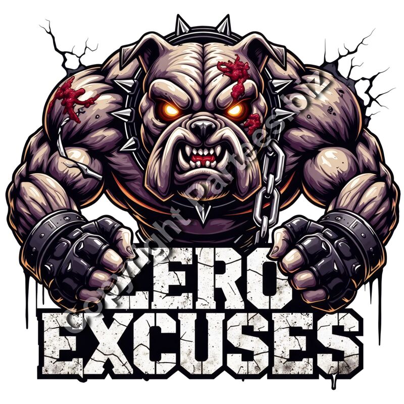 Muscular bulldog with glowing orange eyes and a spiked collar breaking through chains above the bold, distressed text "ZERO EXCUSES."